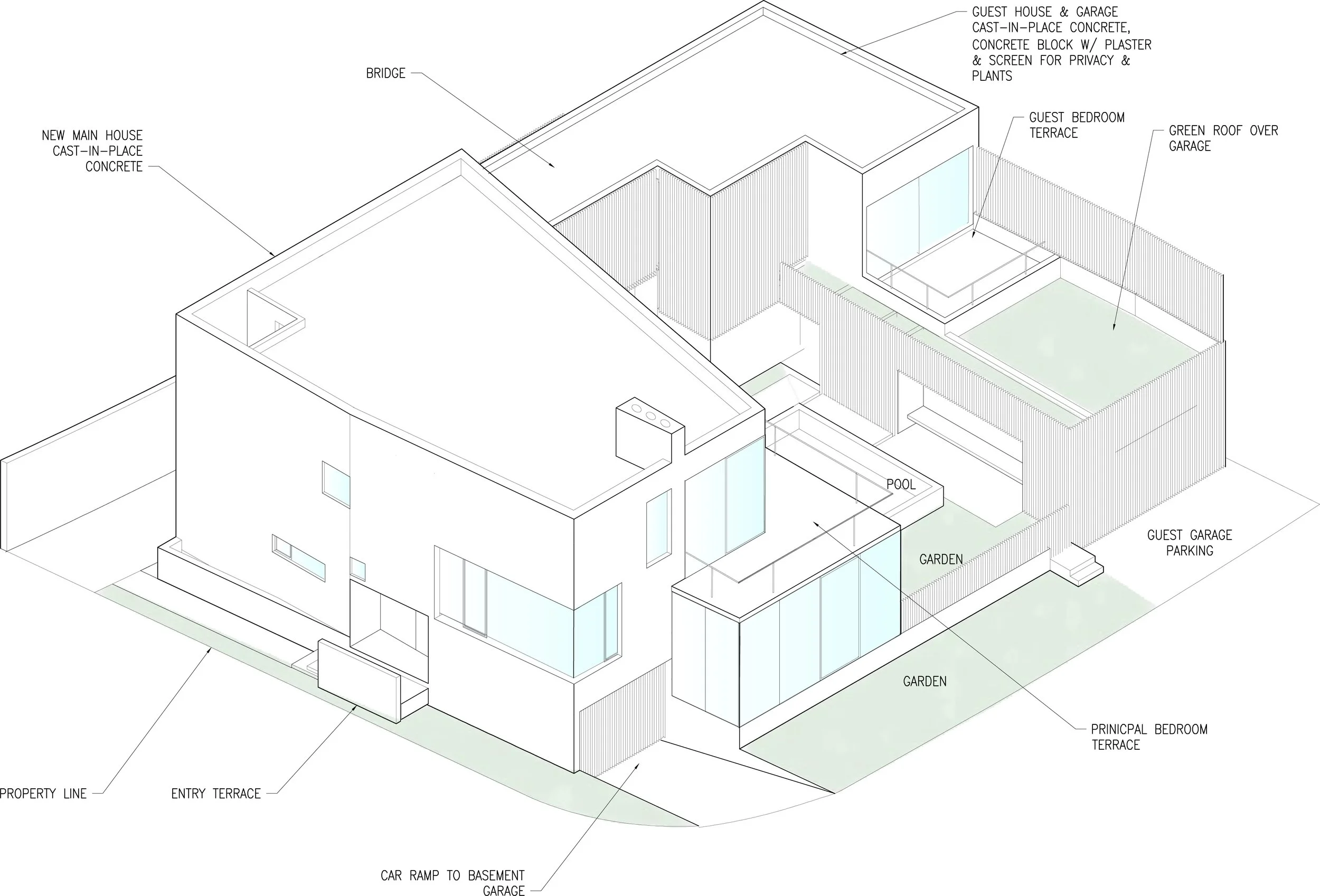 Located in a new development, this house is comprised of two homes: a one-bedroom weekend getaway for the owners, and a two bedroom guest house for extended family and friends. These two houses, each located on separate lots, are joined by a bridge that doubles as a gym/yoga room. Situated on small lots, the main house has an underground garage and a largely solid facade toward the main street. The house opens up to the garden and distant mountain views on the sides and rear, while the guest house minimizes its footprint with a tandem two-car garage. To be built of cast concrete, the house’s shape allows for an open plan with different spaces for living and dining, as well as a mid-level studio. A large chimney with three fireplaces connects the living room, studio and principal bedroom. Status: Design Development.